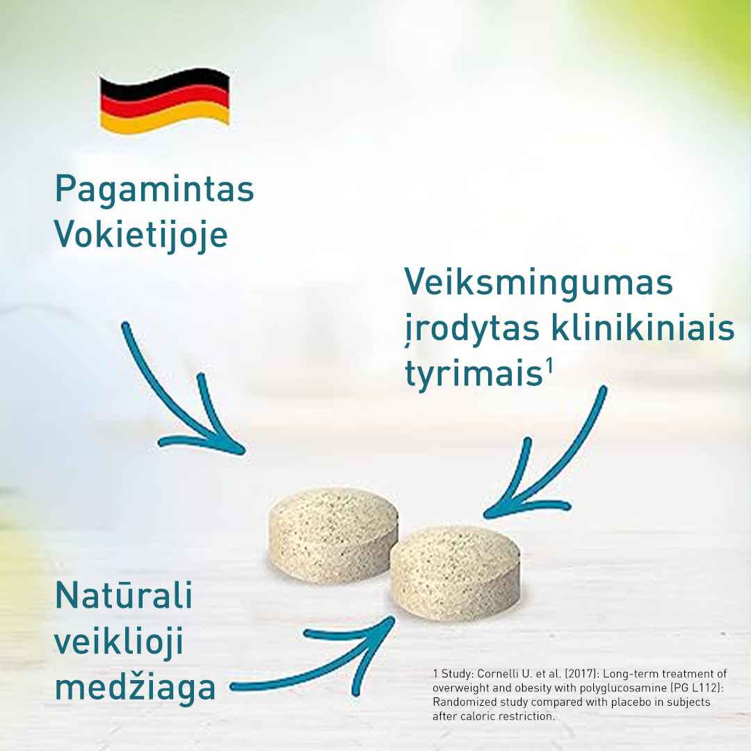 Veiklioji skaidulinė medžiaga poligliukozaminas L112 (73 %): ß-1,4-polimero iš D-gliukozamino ir N-acetil-D-gliukozamino iš vėžiagyvių kiautų specifikacija L112. Pagalbinės medžiagos: askorbo rūgštis, vyno rūgštis, pagalbinės tabletės medžiagos (augalinė celiuliozė, kroskarmeliozės natrio druska, augalinis magnio stearatas, povidonas, silicio dioksidas).