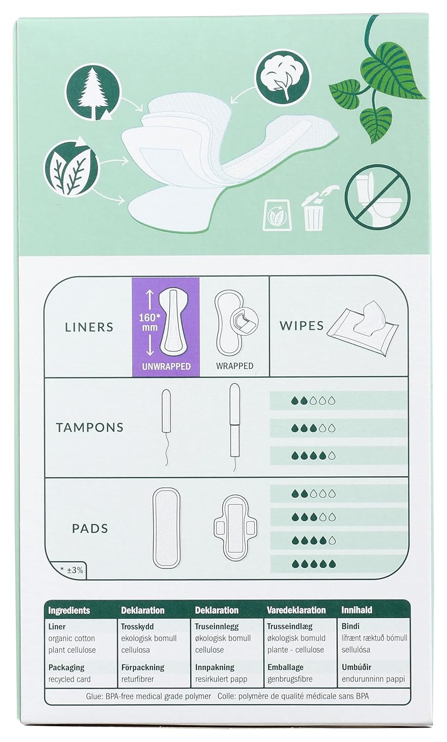 Paviršius: natūrali ekologiška medvilnė, sugeriantysis sluoksnis: augalinė celiuliozė, apsauginis sluoksnis: grūdų krakmolas, lipni juostelė: be chloro.