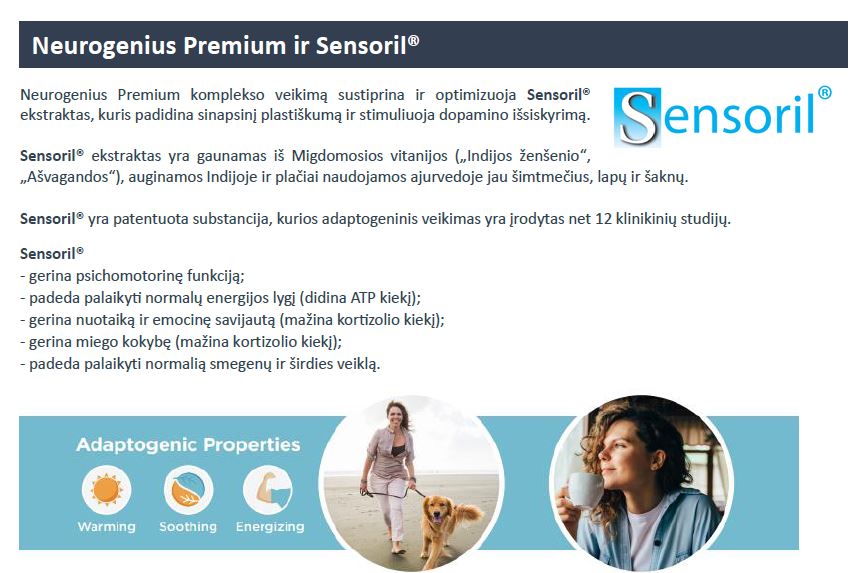 Neurogenius Premium komplekso veikimą sustiprina ir optimizuoja Sensoril® ekstraktas, kuris padidina sinapsinį plastiškumą ir stimuliuoja dopamino išsiskyrimą.